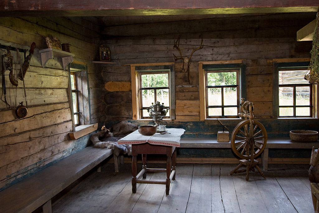 Именно эта легенда легла в основу создания интерьера. Хозяйка избы — мать двоих мальчиков, оставшаяся без мужа, погибшего на охоте. Младшему — года три-четыре; старшему — 10 лет, и он, согласно традициям, уже во всем помогает матери на промысле. В это время мальчик обычно получал от отца свое первое ружьё, как правило, для охоты на уток. Поэтому при входе в избу, над дверью, мы увидим деревянное подобие утки — манок. На вешалке расположено охотничье снаряжение, куда обычно входили: пороховница, рог для капсулей, мерка для пороха и мешочек для пуль. Над печкой сушатся лузаны, взрослый и детский — своеобразные холщовые рубахи без рукавов с кожаными наплечниками. Они защищали зверовщика от сырости и холода; в большие карманы, расположенные спереди и сзади, можно было складывать добычу. У печки сушатся лыжи — взрослые охотничьи, подбитые оленьим мехом, и детские.