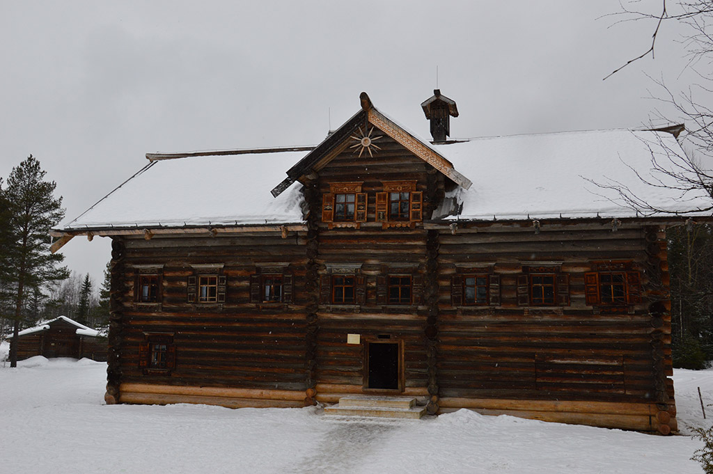 Каргопольское село «Большой Халуй», древнее поселение, существовавшее еще до возникновения Ошевенской слободы, вошло затем в ее состав, и на начало ХХ в. было весьма велико — о ста дворах. Дом перевезен в музей в 1974 г. Последним жителем дома был Александр Федорович Пухов, дед которого построил этот дом в 1812 г. Семья была зажиточной. Жители села вспоминают, что Александр Федорович хвалился: «Если бы по всей деревне хлеб не вырос, я мог бы два года всю деревню кормить». Семья Пуховых была старообрядческая, принадлежали они к толку странников-бегунов, но сами из дому не уходили, а были странноприимцами, пристанно-держателями2.
