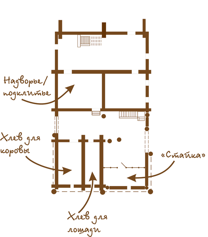 Надворье (Олонецкое)/подклитье (Каргопольское) — помещение для приготовления теплого пойла скоту.