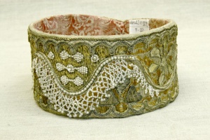 Повязка — девичий праздничный головной убор, который представляет собой широкую полосу на твёрдой основе, обшитую позументом фабричного производства. Нижняя часть повязки — из серебристой фольги, поделенная, как правило, на 5 квадратов, орнаментирована бисером. Почти все узоры на повязках из Мезенского уезда похожи на восьмиконечные снежинки или снежинки с лучевыми и восьмиугольными розетками. Повязка заканчивается изящной бисерной поднизью. Сзади повязка завязывается на широкие ленты.