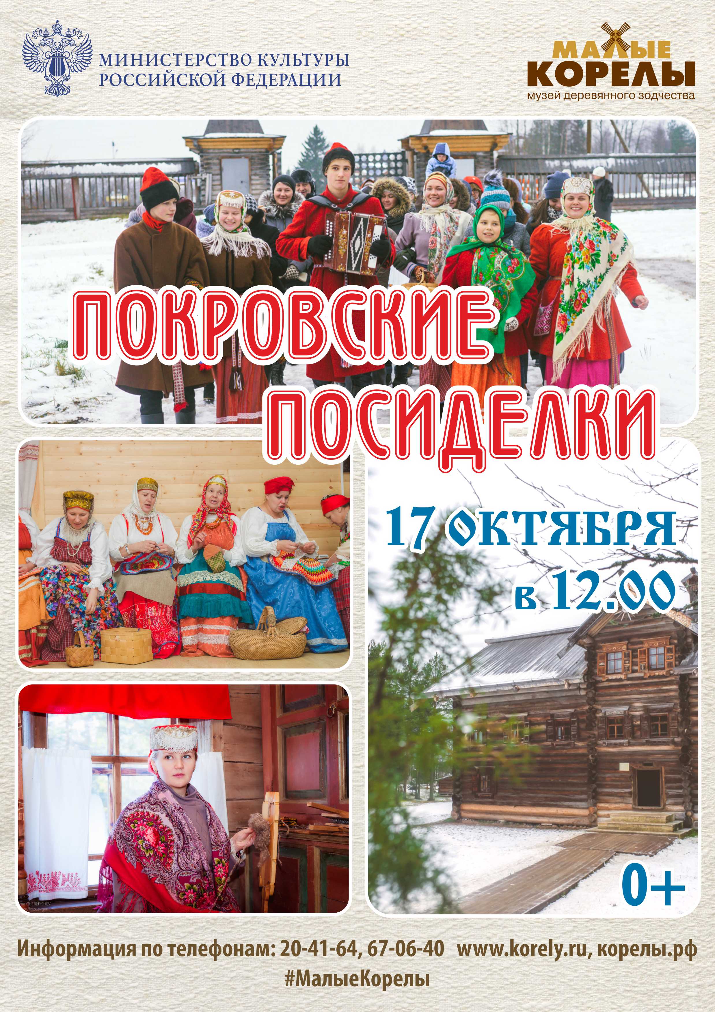 17 октября в Каргопольско-Онежском секторе музея «Малые Корелы» состоится игровая программа «Покров весело проведёшь — дружка милого найдёшь». На центральной площади артисты театра «Новиця» покажут этнографические картинки, посвящённые Покрову. В творческой мастерской гости музея станут участниками фольклорной программы «Покровские посиделки». В доме Пухова с 11 до 16 часов на мастер-классах можно будет научиться прясть и плести пояса, а также сделать своими руками куклу «Параскева Пятница». Украсят праздник колокольные звоны.