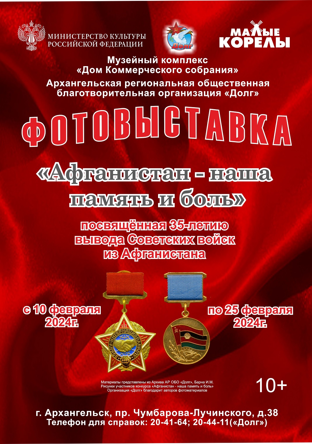 Она посвящена 35-летию вывода советских войск из Республики Афганистан — памятная дата отмечается 15 февраля. На выставке будут представлены фотографии из архива Архангельской региональной общественной благотворительной организации «Долг», где отражены ход боевых действий и мирная жизнь афганцев, перезахоронение погибших земляков и трудовые будни членов «Долга», а также рисунки участников конкурса «Афганистан — наша память и боль».