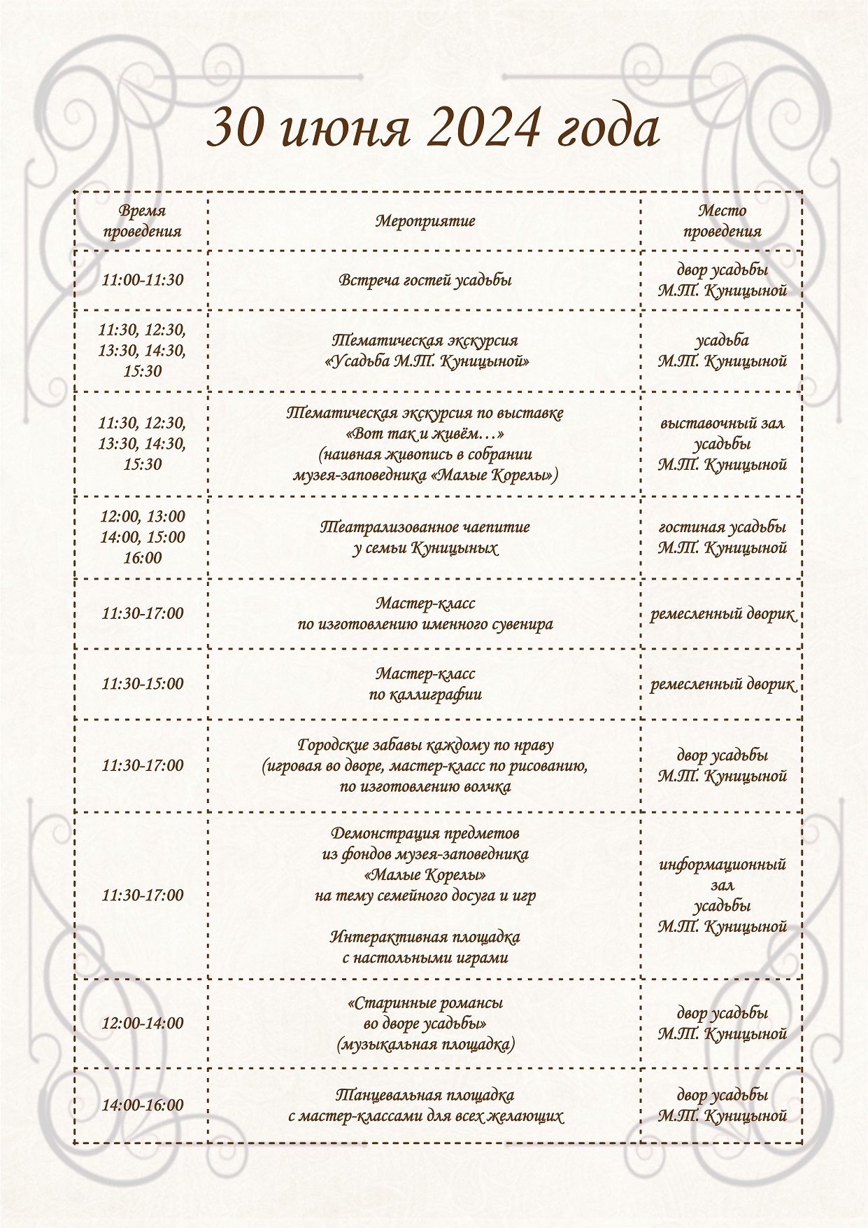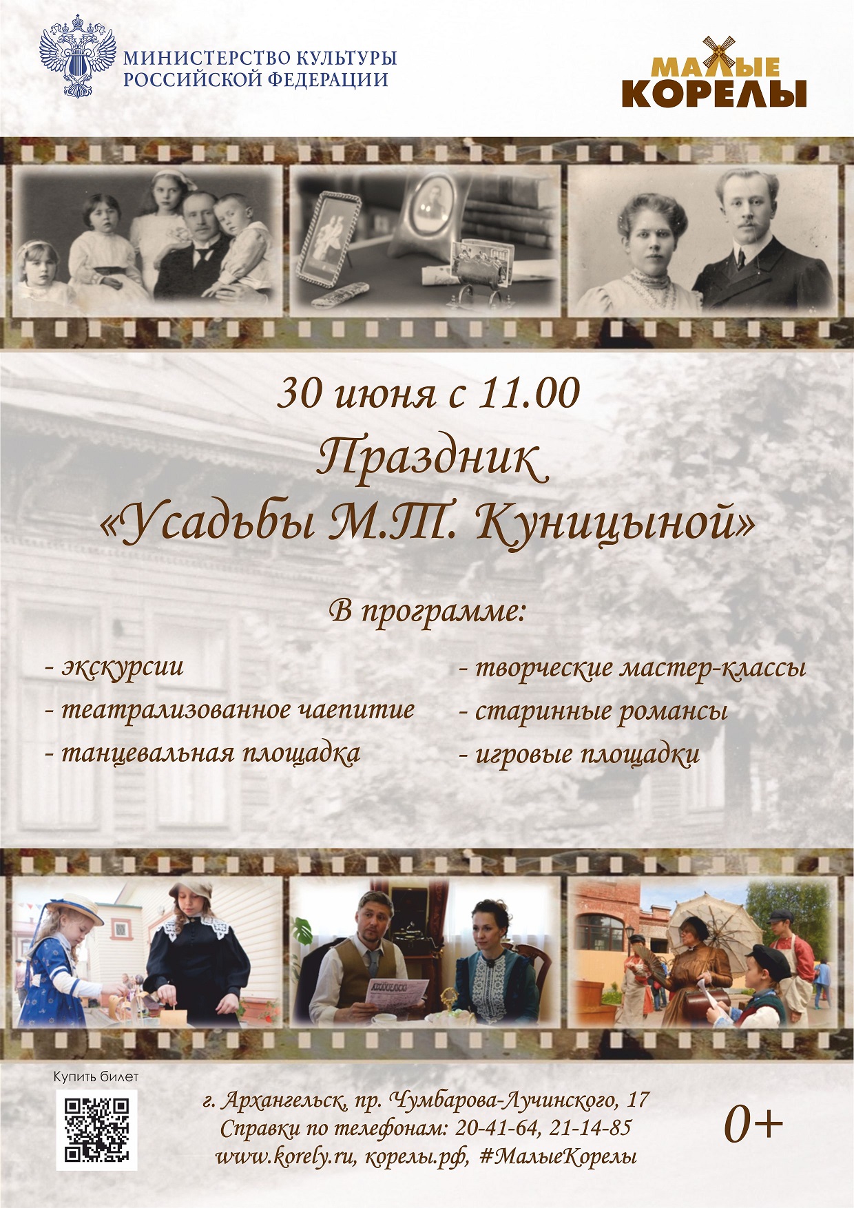 В программе праздника, который начнётся в 11 часов, — экскурсии по усадьбе и выставке «Вот так и живём...», представляющей работы северных мастеров наивной живописи ХХ века из собрания музея-заповедника «Малые Корелы», а также театрализованное чаепитие с сюрпризами у четы Куницыных.