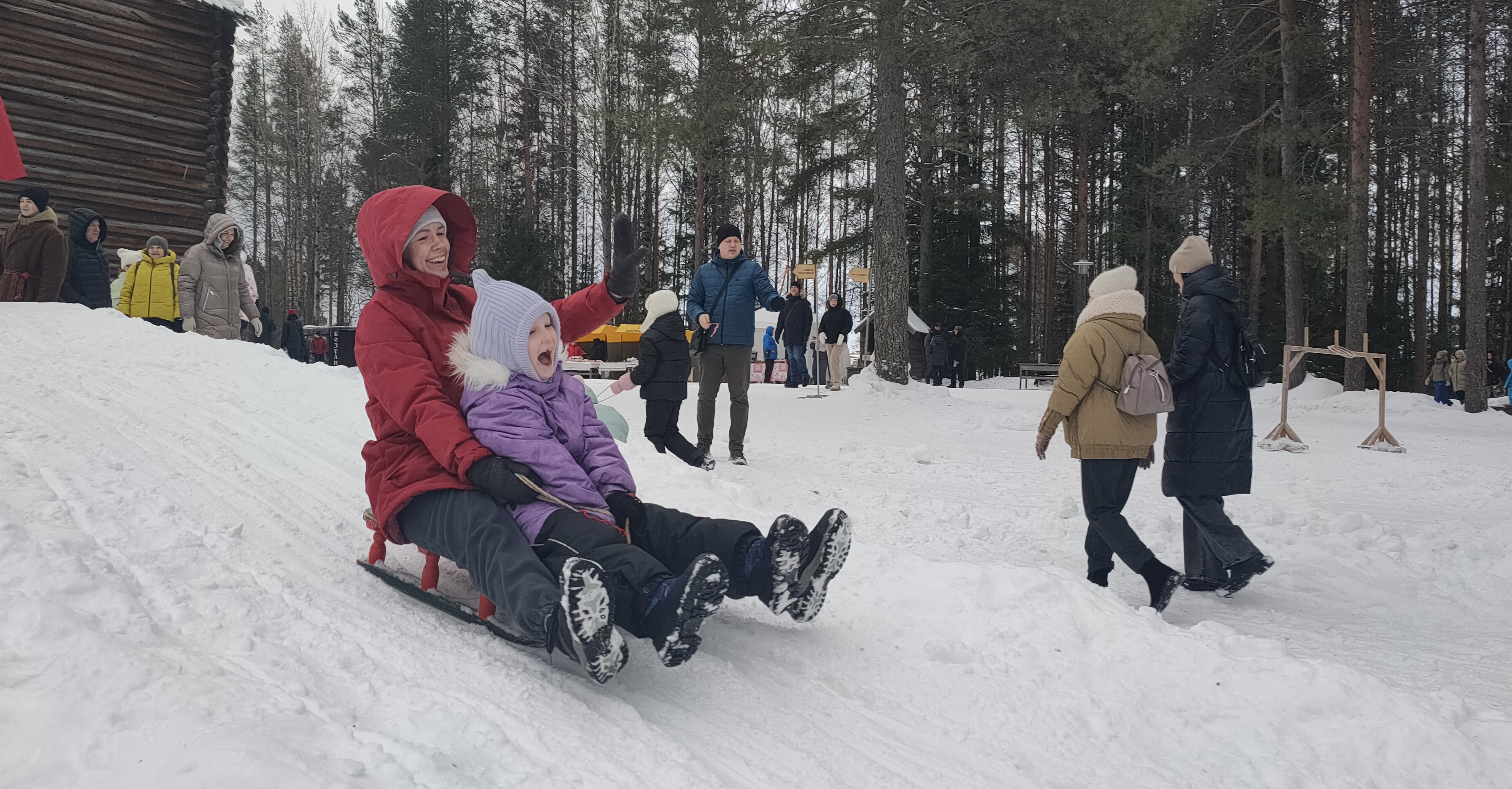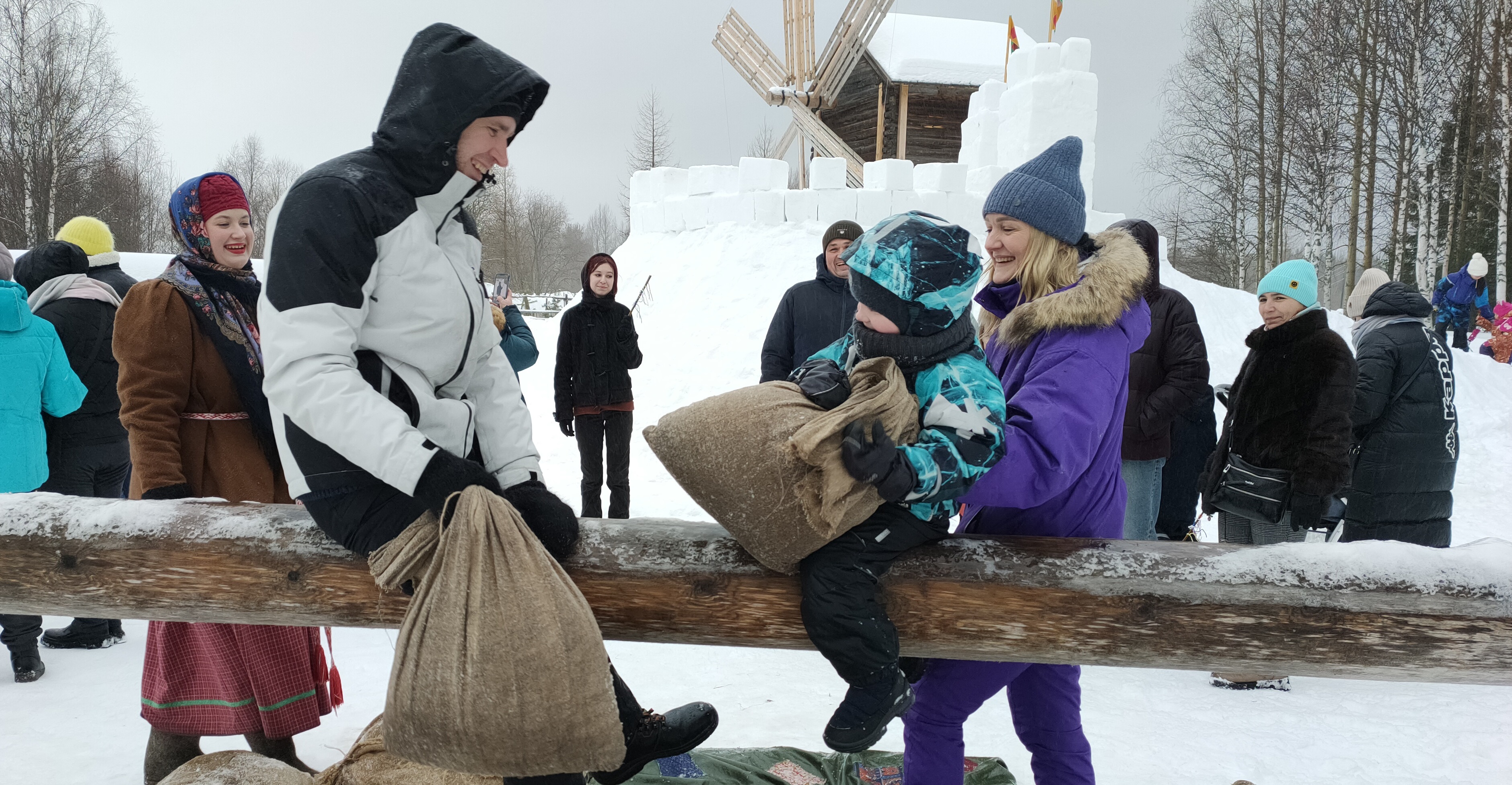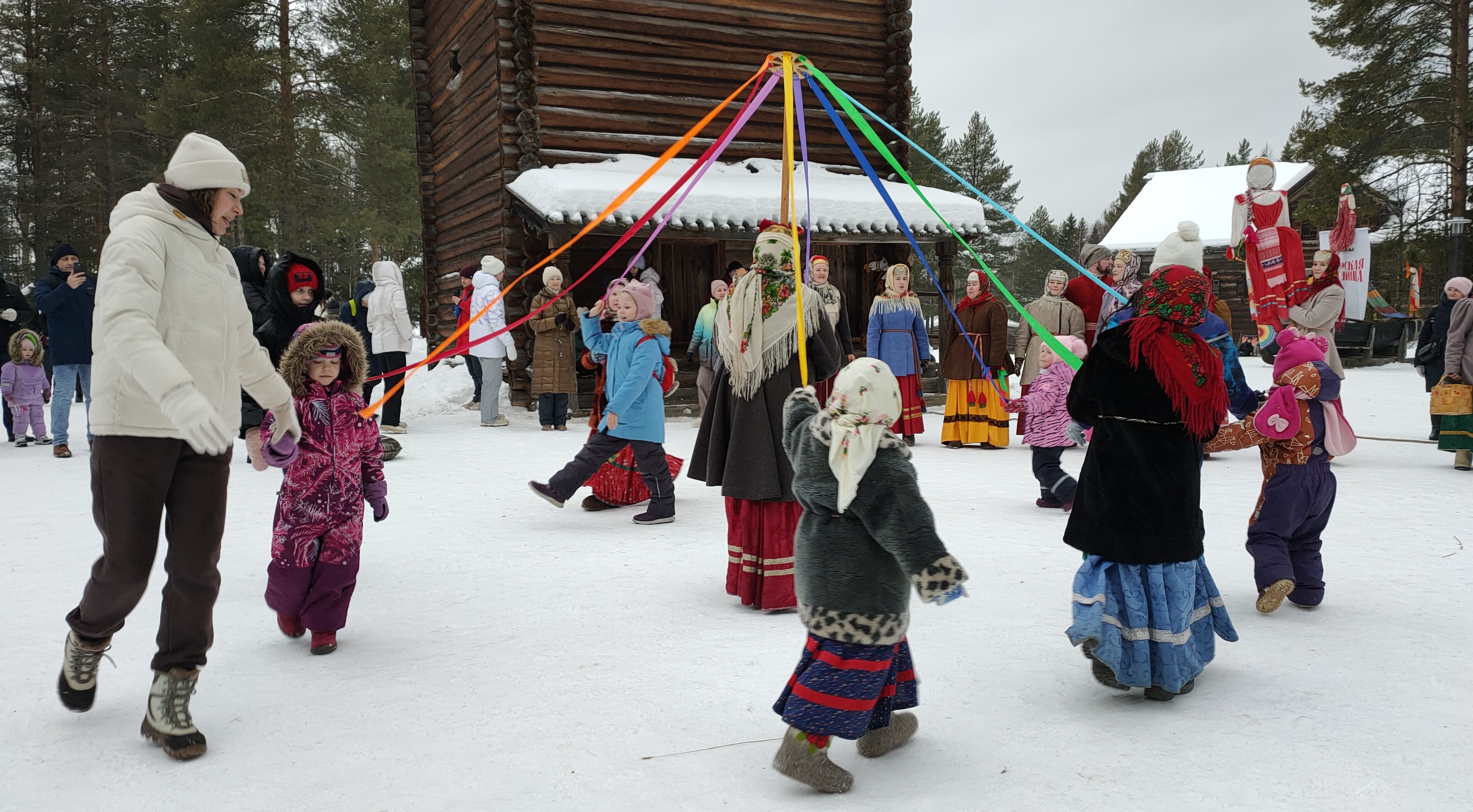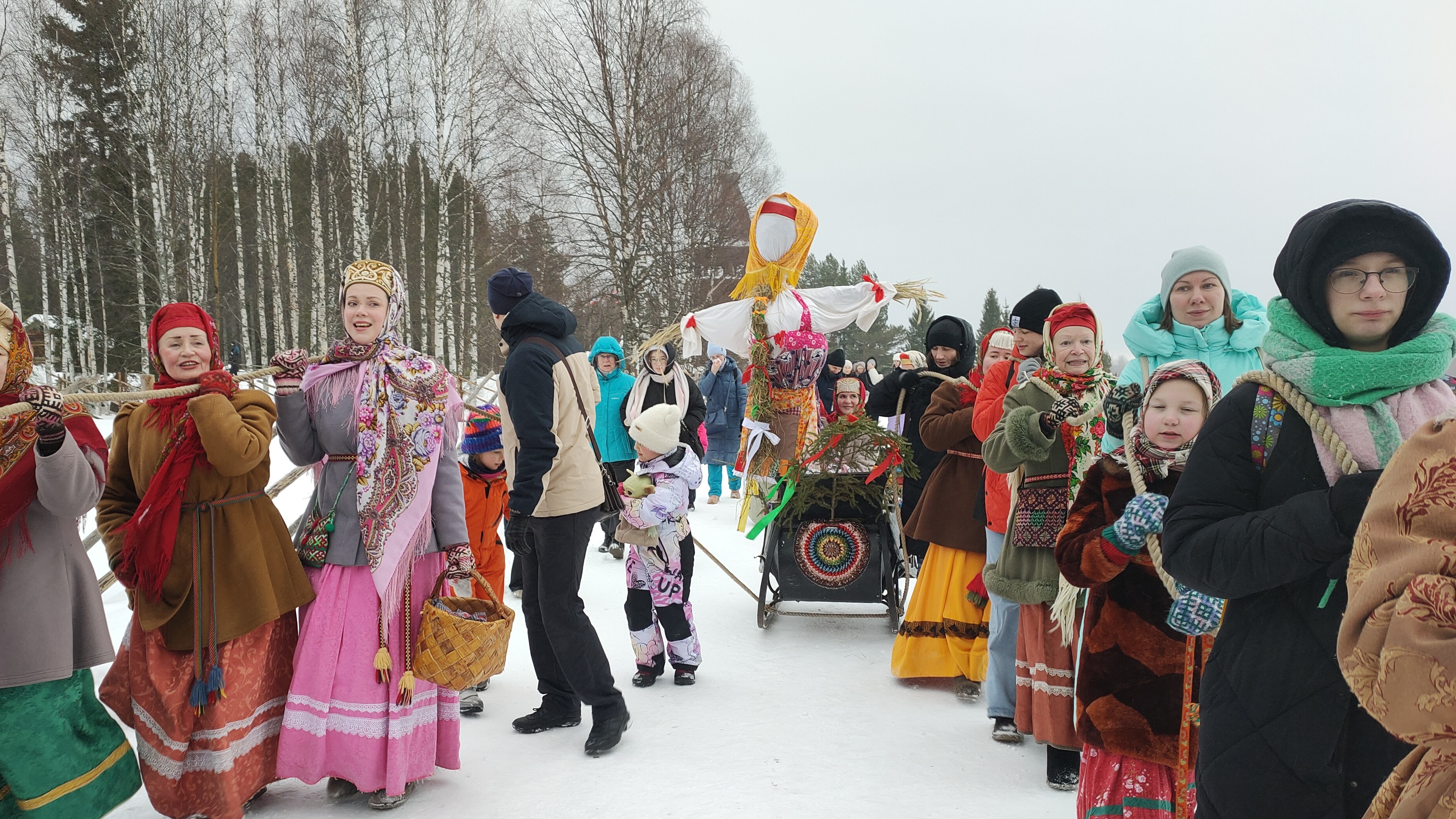 Гости «Малых Корел» вместе с артистами театра «Новиця» обошли деревенские дворы, собрали всё необходимое: сено, солому, старые вещи — для создания куклы Маслёны, а потом провезли её по музею на санях масленичным поездом под частушки и барабанный бой.