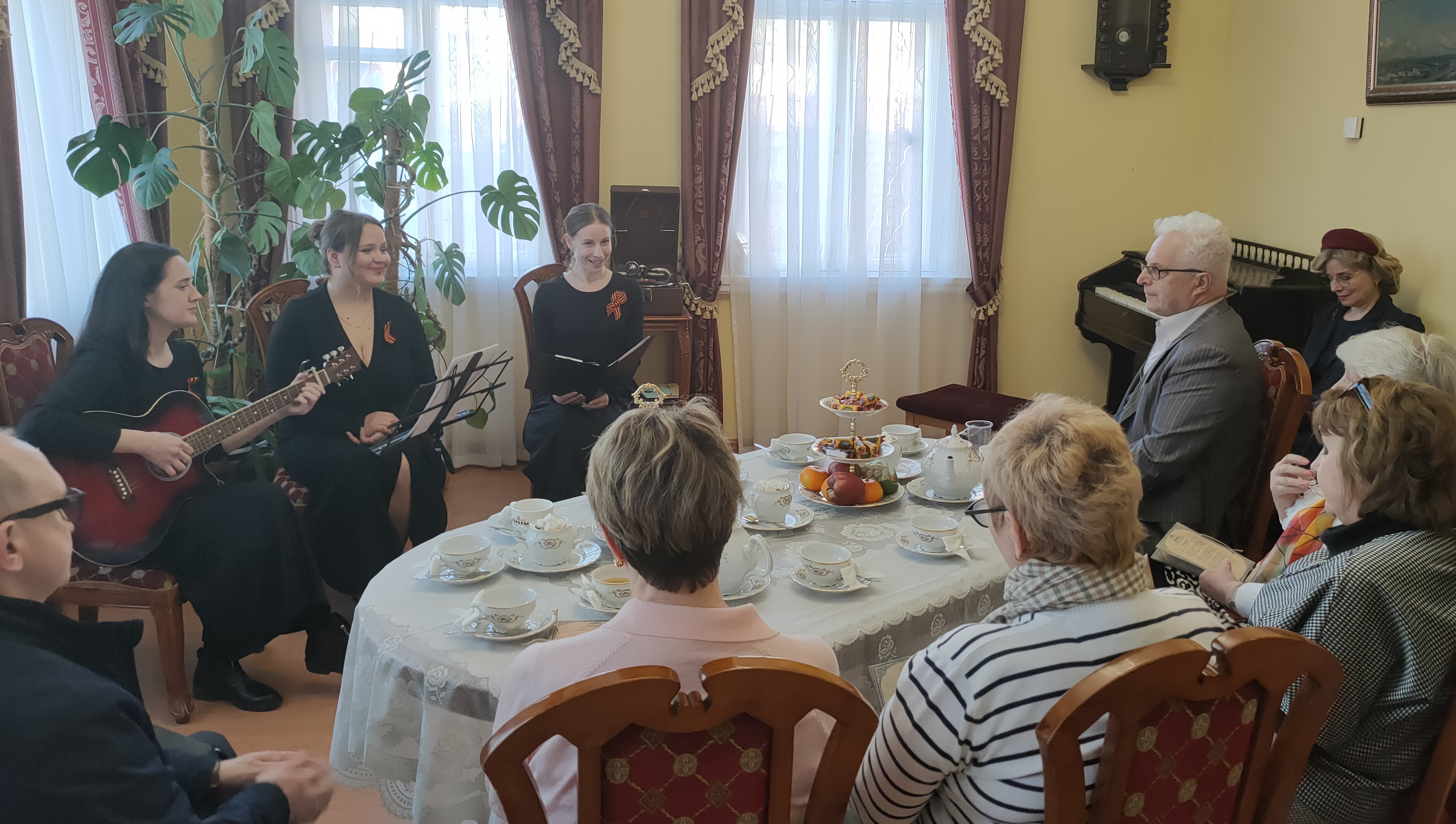 В усадебной гостиной в течение вечера звучали песни, которые вели к Победе: вместе с дуэтом «Поветерь» гости музея смогли спеть советские песни довоенного времени, песни