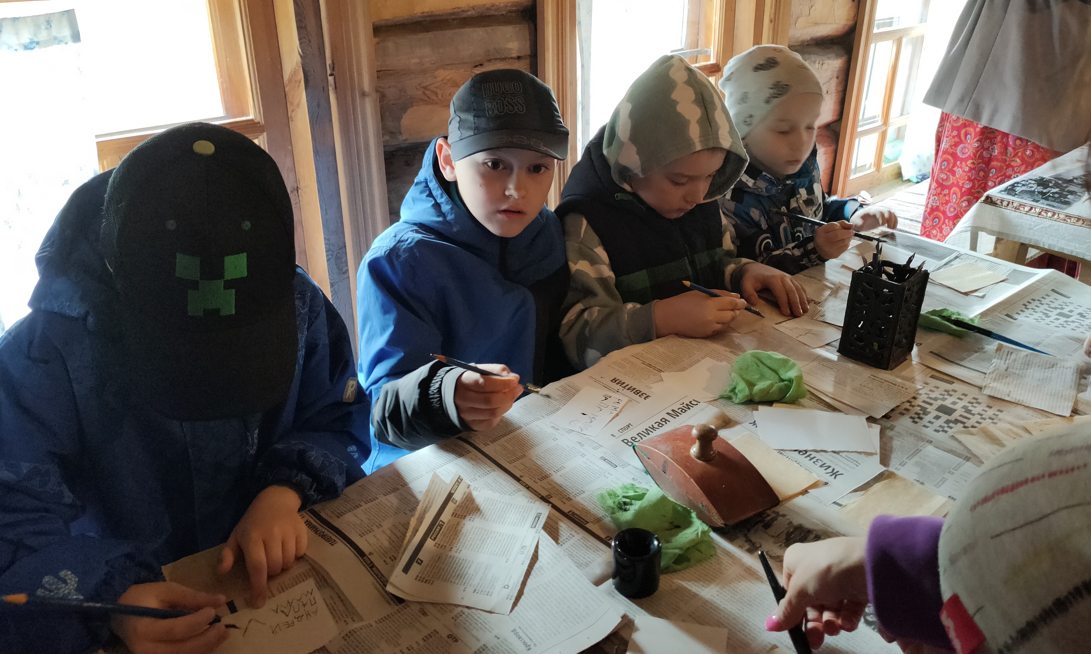 После этого началась одноимённая игра-путешествие по Мезенскому сектору. Дети узнали, как жили в северной деревне в военное время и как в ту пору учились в школе их сверстники: попробовали написать текст перьевой ручкой и чернилами на газетной бумаге и мелом — на грифельной доске. На площадке, посвящённой играм, в которые играли 80 лет назад, ребята смогли поиграть в чины, пристенок, штандер — стой, покатать колесо.