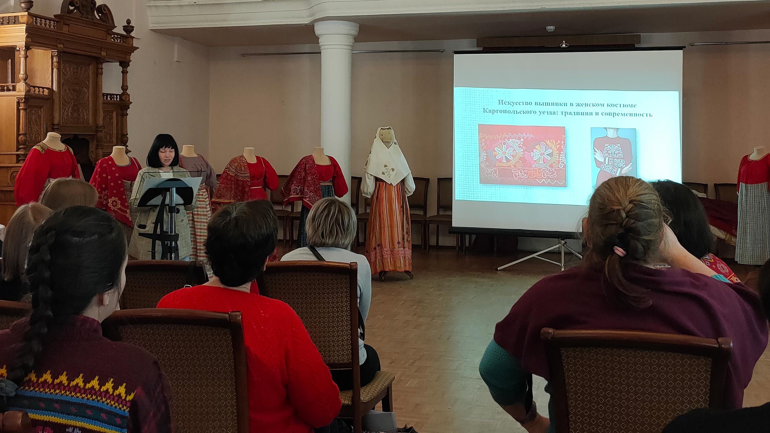 24 участницы программы, приехавшие в Архангельск из Северодвинска, Новодвинска, Вельска, Каргополя, Плесецка, Мирного, Красноборска, а также из Москвы и Переславля-Залесского, познакомились с коллекцией традиционного женского костюма Каргопольского уезда из собрания музея-заповедника «Малые Корелы» — обзор представила хранитель коллекции «Ткани. Меха. Кожа» Юлия Чекунина. Доклад о лоскутном шитье в традиционном костюме народный мастер РФ, руководитель клуба лоскутного шитья «Ляпачок» Галина Полякова построила также на основе анализа коллекции «Малых Корел». Мастер студии «Русские начала», дизайнер Юлия Еремеева поделилась опытом реконструкции и создания реплики традиционного каргопольского девичьего костюма. Педагог Детской школы народных ремёсел, народный мастер РФ Дарья Громова рассказала об особенностях вышивки в женском костюме этой местности.