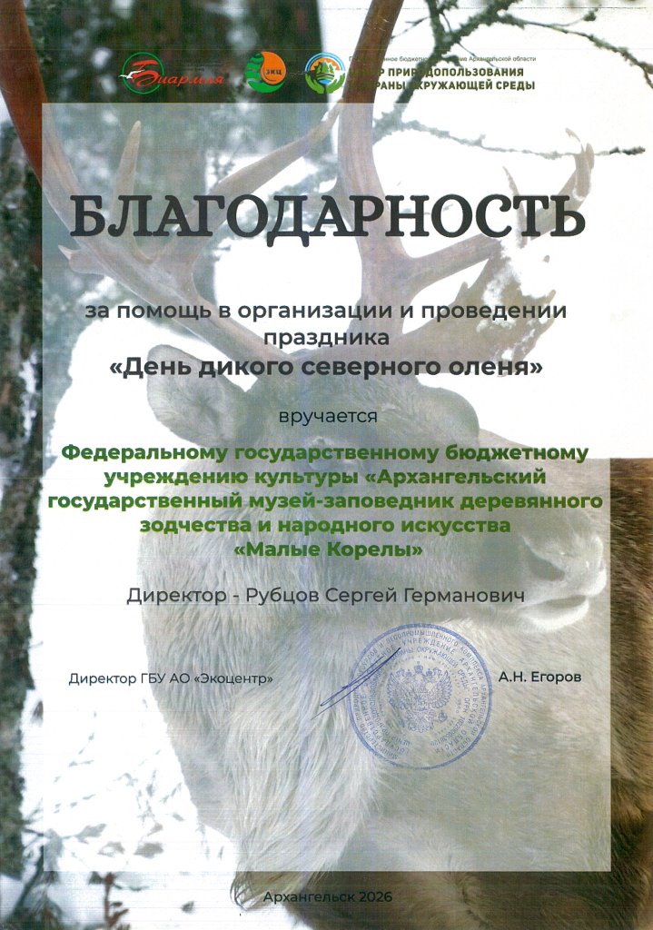 Благодарность за помощь в организации и проведении праздника «День дикого северного оленя»