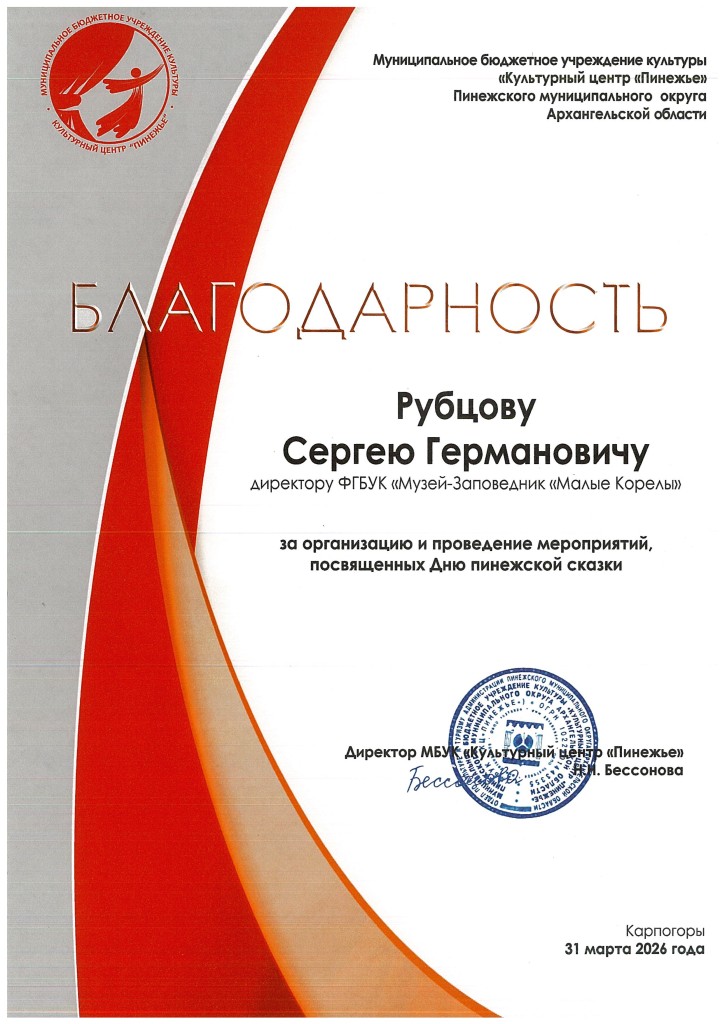 Благодарность за организацию и проведение мероприятий посвященных Дню пинежской сказки